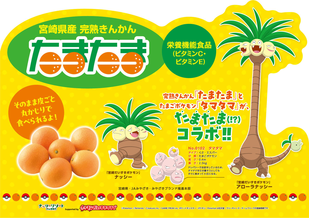 2020年10月、ナッシーとアローラナッシーは「宮崎だいすきポケモン」に任命されました!宮崎県の県の木には、ヤシ科の「フェニックス」が制定されており、ヤシの木のような見た目で、「歩く熱帯雨林」と呼ばれるナッシーは、宮崎県のイメージにピッタリ!温暖な気候で一年中温かく、「日本のひなた」とも呼ばれる宮崎県と相性バツグンのナッシーが、さまざまな取り組みで宮崎県を盛り上げていくれています!!